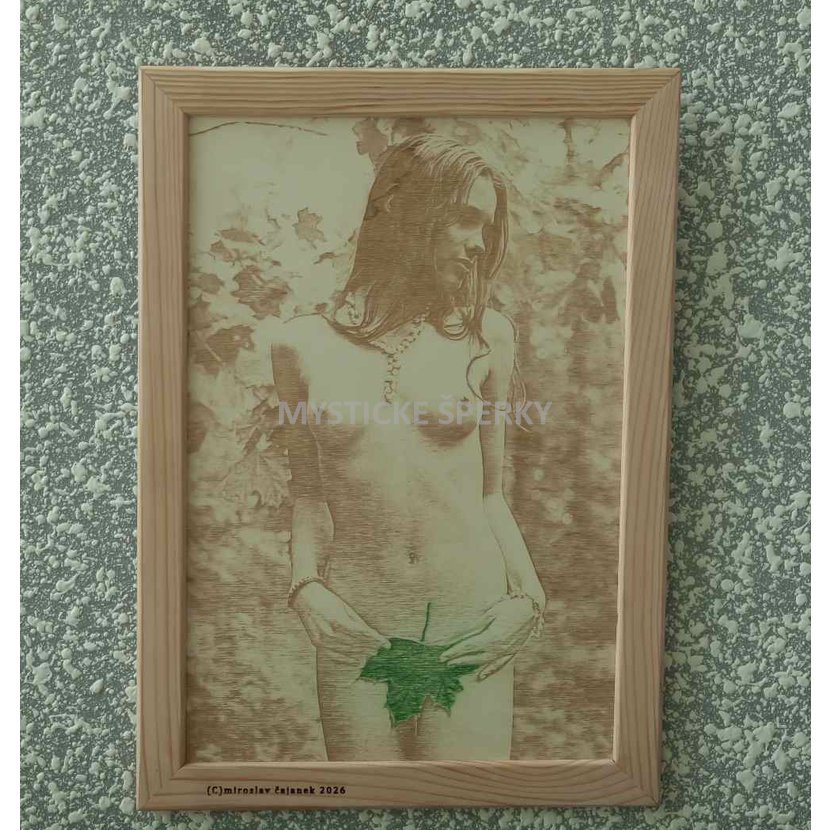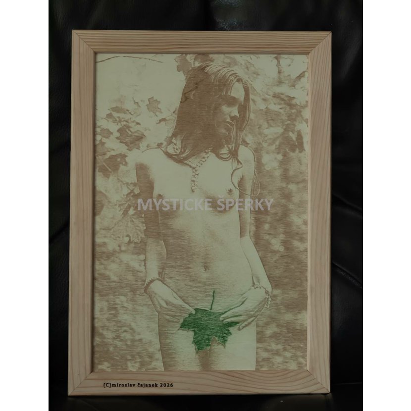 Miroslav Čajánek – Akt s javorovým listem | Gravírovaná fotografie na dřevě
