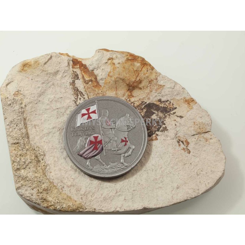 Symbolika: Druhá strana mince je zdobená dynamickým a detailním reliéfem rytíře na koni, s typickou templářskou zástavou (Beauséant) a dalšími tradičními symboly řádu.
