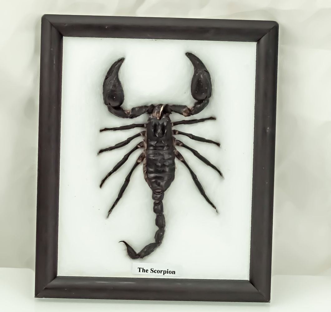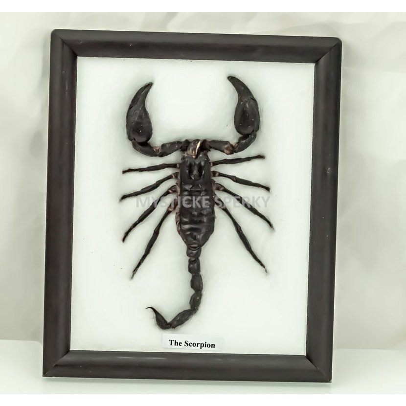 Originální nástěnná dekorace pro milovníky přírody, exotiky a netradiční estetiky. Ručně preparovaný pravý štír je pečlivě umístěn do elegantního tmavého zaskleného rámečku, který podtrhuje jeho přirozenou krásu i dramatický kontrast.