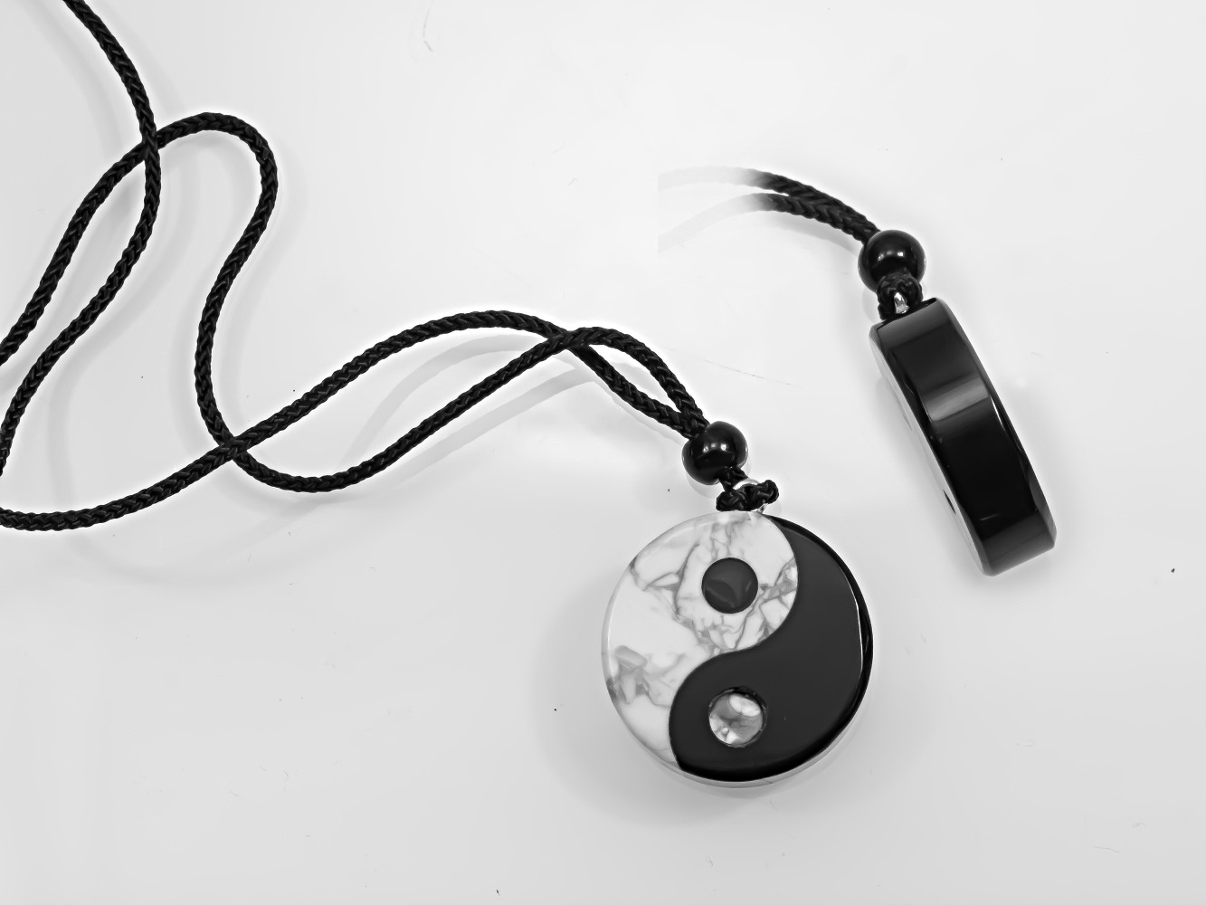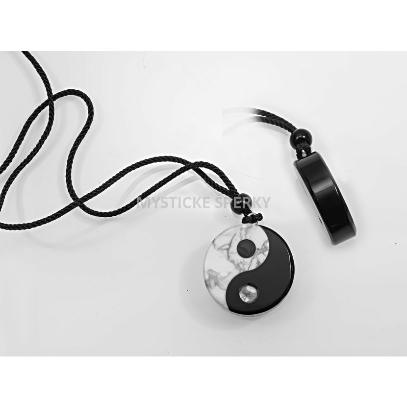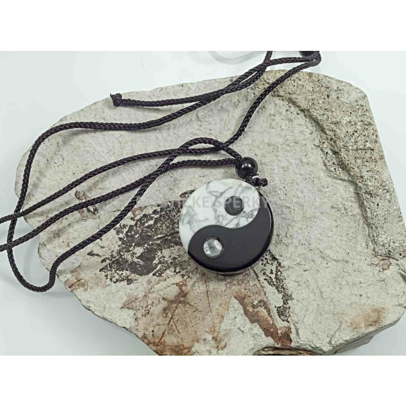 Elegantní amulet s motivem Jin Jang, symbolem harmonie a rovnováhy, je zhotoven z přírodních drahokamů Howlitu a Obsidiánu. Kombinace těchto kamenů umocňuje hluboký duchovní význam šperku – propojení protikladů, světla a tmy, klidu a síly.