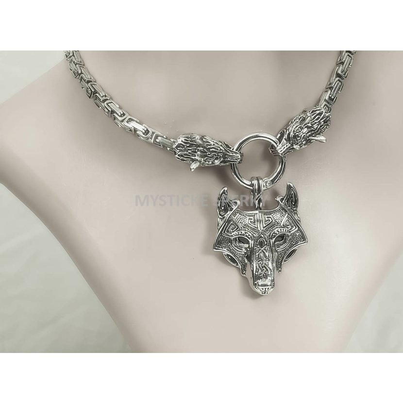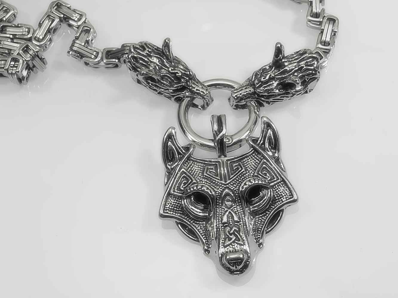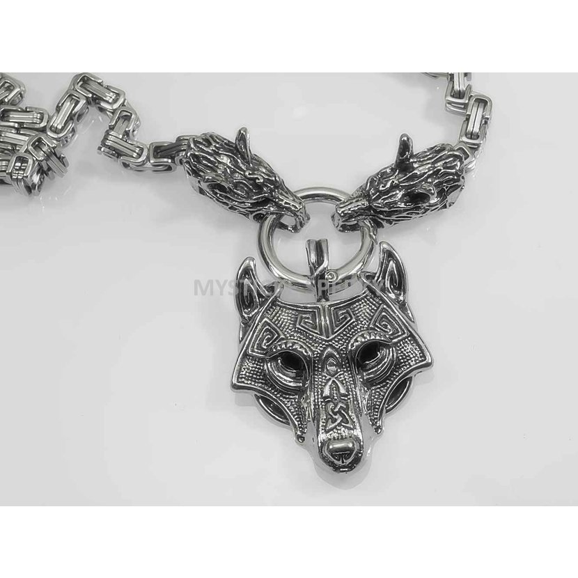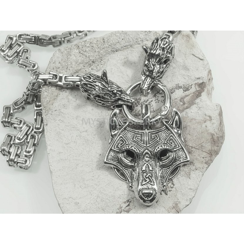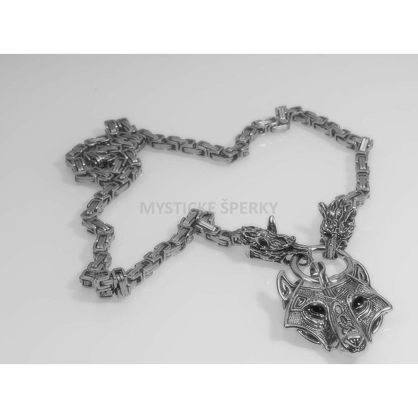 Řetízek je zakončen exkluzivní, do detailu propracovanou koncovkou ve tvaru dvou vlčích hlav. Tyto vlčí hlavy, inspirované severskou a keltskou mytologií, slouží jako robustní a designový uzávěr, který dodává celému šperku jedinečný, divoký a nezkrotný charakter. Vlk symbolizuje inteligenci, věrnost, volnost a sílu v boji.