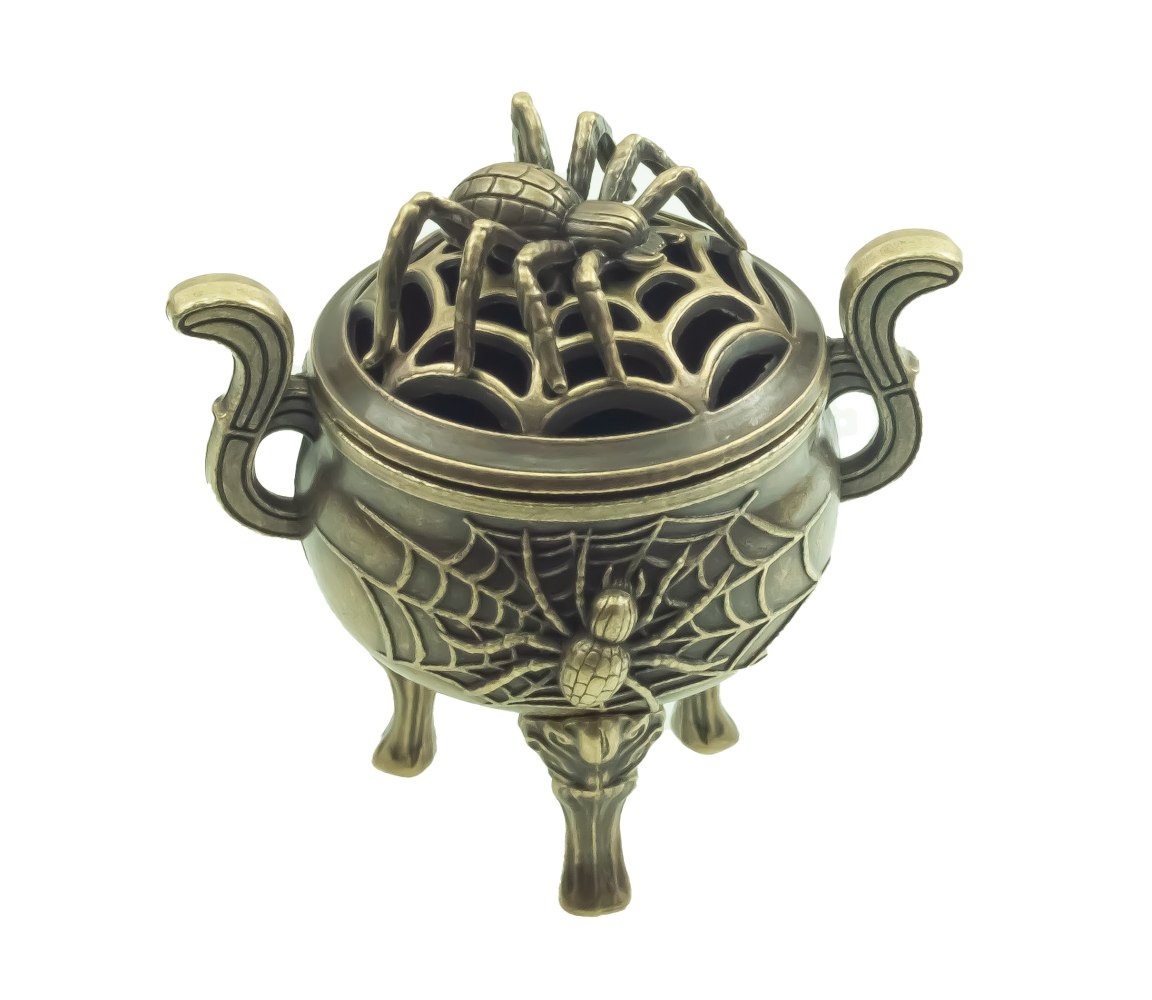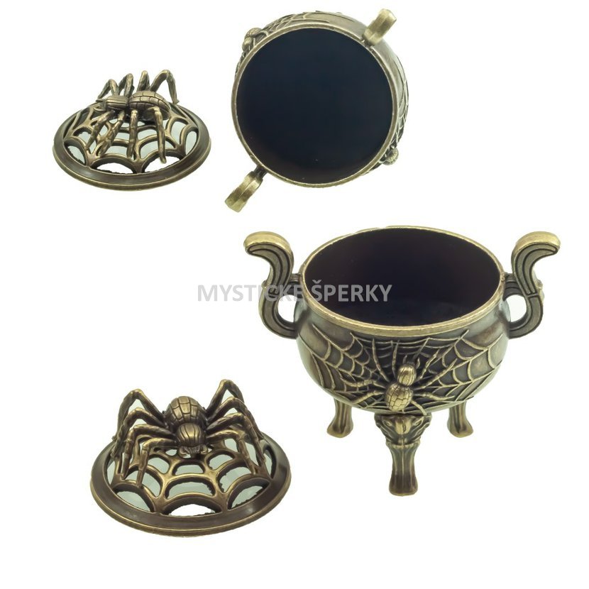 Kovové vykuřovadlo, kadidelnice ve tvaru obřadní nádoba na třech nohách. Zdobena Pavoučími motivy. Povrchová úprava patinovaný bronz.